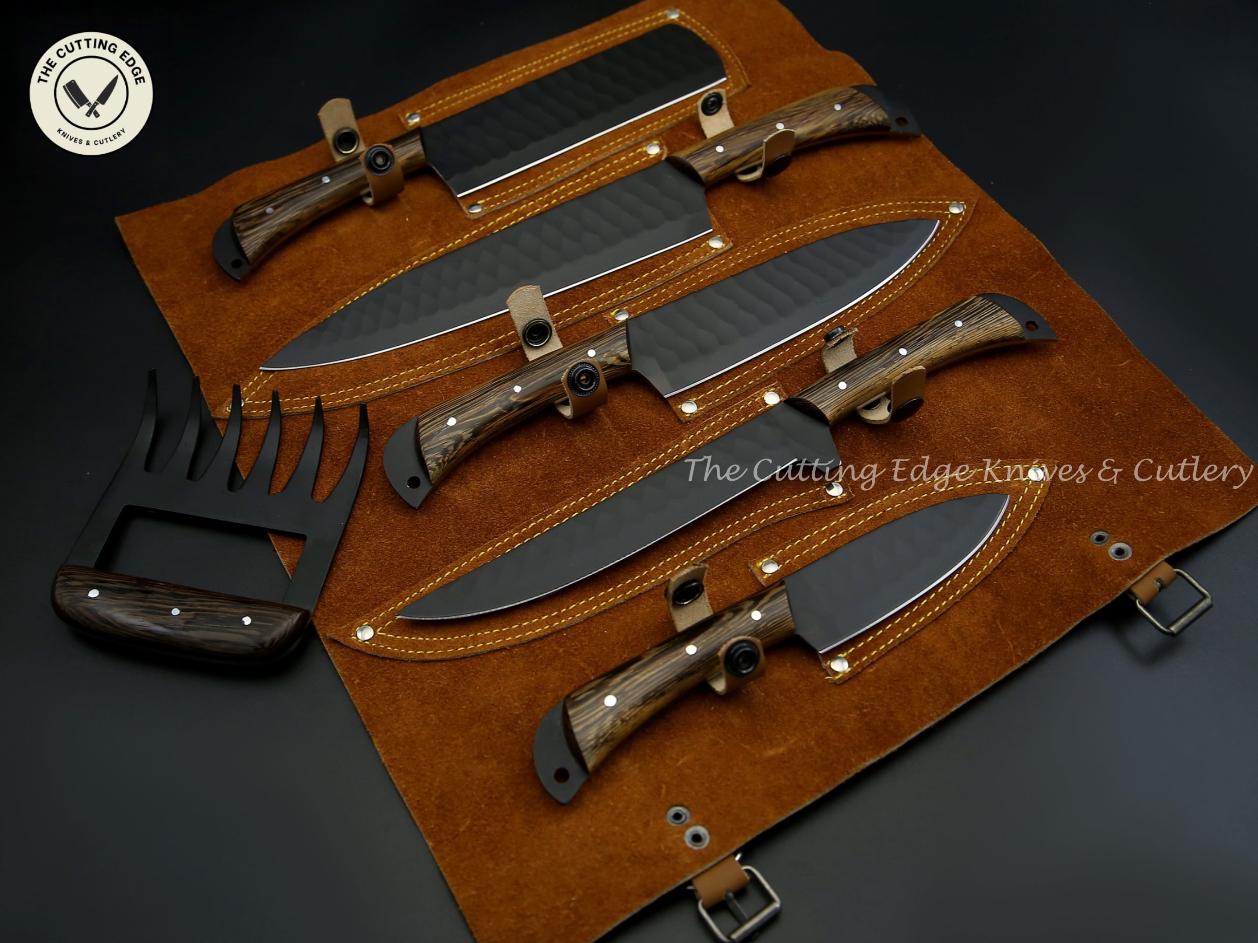 To ensure the longevity of your knife set, it is recommended to hand wash the blades with mild soap and warm water after each use. Dry the knives thoroughly before storing them in the provided leather sheath. Avoid using abrasive cleaners or placing the knives in the dishwasher, as it may damage the blades and handles.