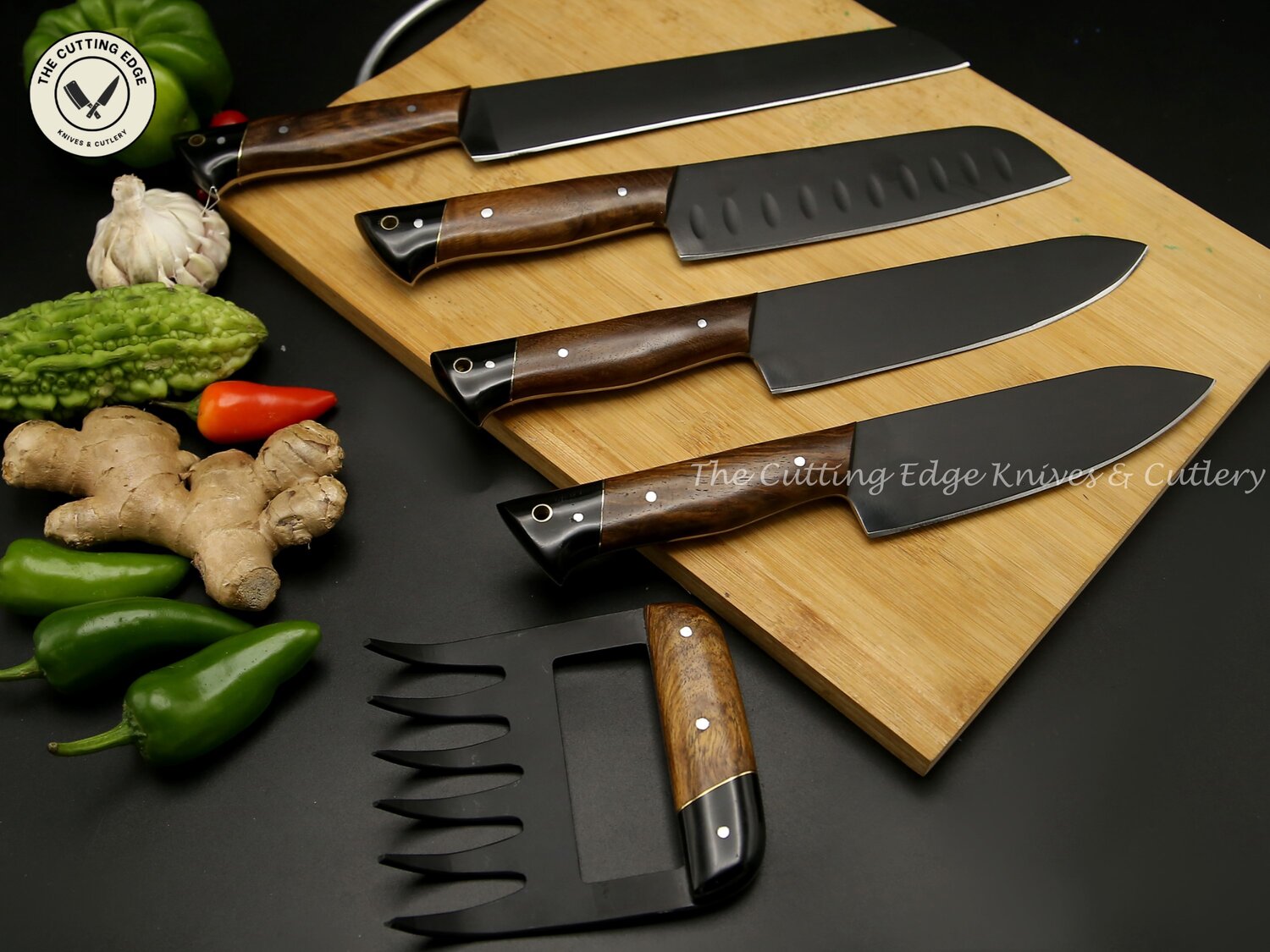 Introducing our exquisite knife set with BBQ claw, featuring a blend of wood and a resin handle for the ultimate balance of elegance and functionality. Each knife in this set boasts a full tang construction, ensuring durability and stability during use.
